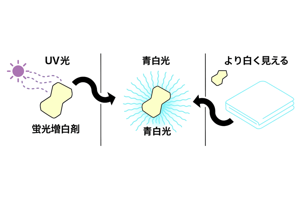 ほとんどの布は、わずかに黄みがあるので、市販の白物衣料の多くは、製造段階でこの蛍光剤が使われる場合があります1